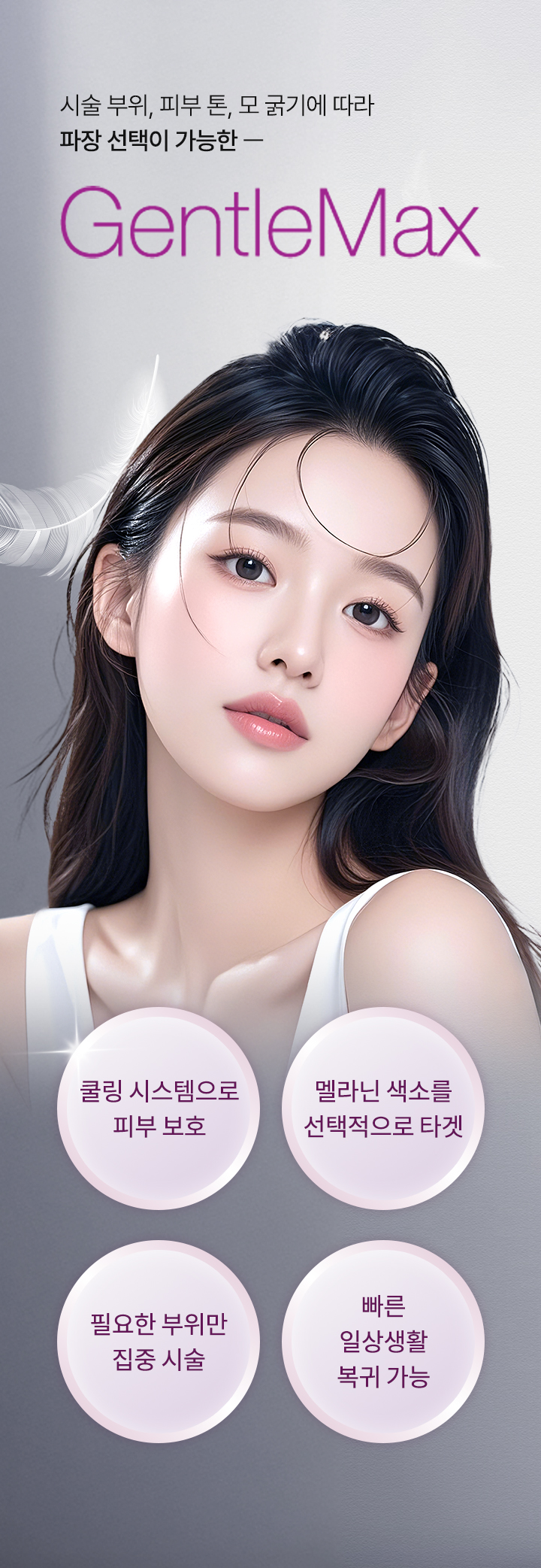 755nm 알렉산드라이트와 1064nm 엔디야그 듀얼 파장 레이저로, 피부톤과 모 굵기에 맞춰 파장을 선택해 조사합니다.