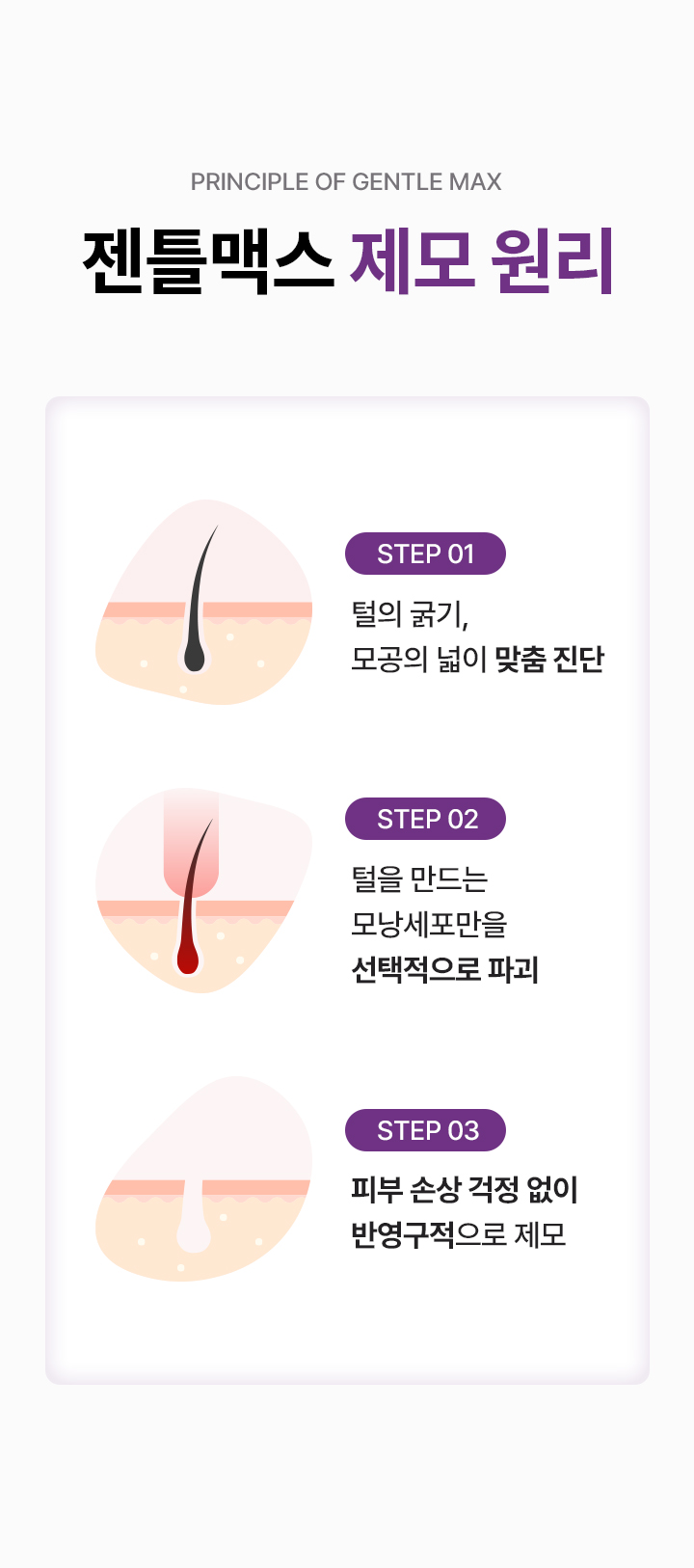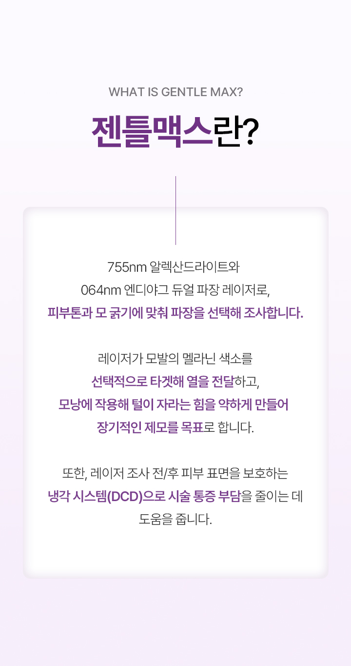 레이저가 모발의 멜라닌 색소를 선택적으로 타겟해 열을 전달하고, 모낭에 작용해 털이 자라는 힘을 약하게 만들어 장기적인 제모를 목표로 합니다. 또한, 레이저 조사 전/후 피부 표면을 보호하는 냉각 시스템(DCD)으로 시술 통증 부담을 줄이는 데 도움을 줍니다.